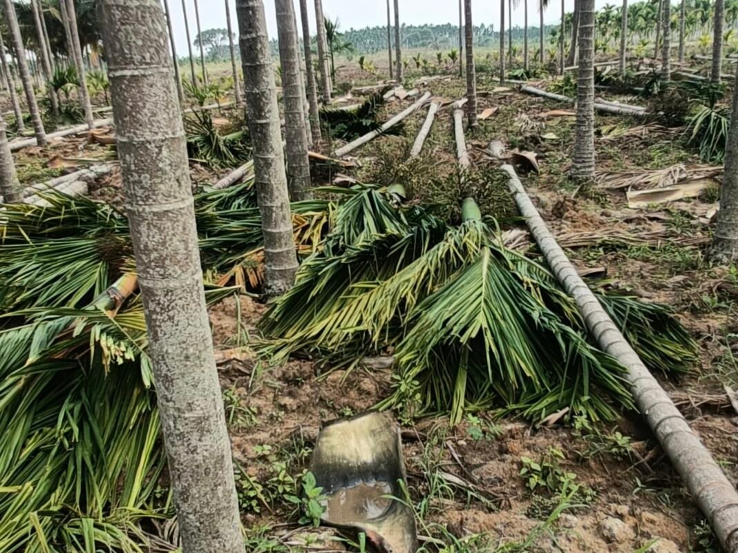 Home News ಹಲ್ಮಿಡಿಯಲ್ಲಿ ಬಿರುಗಾಳಿ-ಮಳೆಗೆ ಧರೆಗುರುಳಿದ ಅಡಿಕೆ ಮರಗಳು; ರೈತನಿಗೆ ಭಾರೀ ನಷ್ಟ