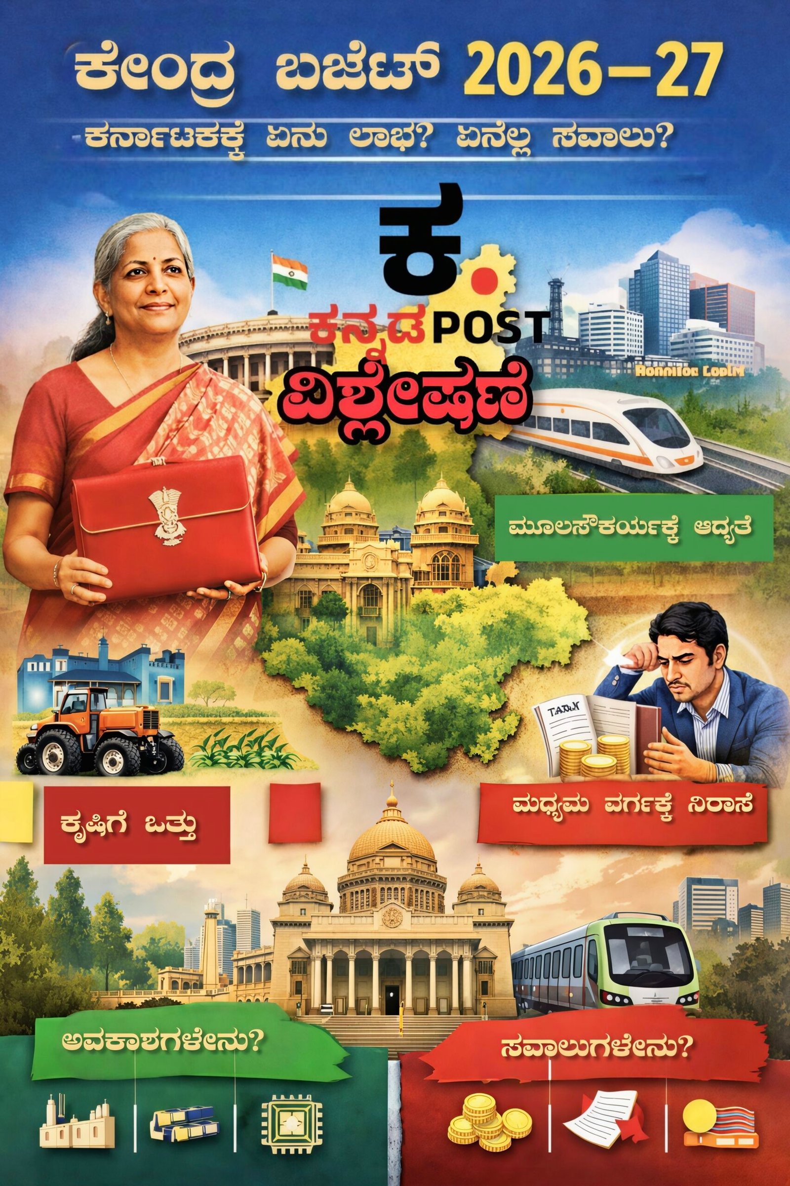 ಕೇಂದ್ರ ಹಣಕಾಸು ಸಚಿವೆ ನಿರ್ಮಲಾ ಸೀತಾರಾಮನ್ ಅವರು ಇಂದು ಸಂಸತ್ತಿನಲ್ಲಿ ಮಂಡಿಸಿದ ಕೇಂದ್ರ ಬಜೆಟ್ 2026–27 “ವಿಕಸಿತ ಭಾರತ 2047” ಎಂಬ ದೀರ್ಘಾವಧಿ ಗುರಿಯಡಿ ರೂಪುಗೊಂಡಿದ್ದು, ಮೂಲಭೂತ ಸೌಕರ್ಯ, ತಂತ್ರಜ್ಞಾನ, ಉದ್ಯೋಗ ಸೃಷ್ಟಿ ಮತ್ತು ಹಣಕಾಸು ಶಿಸ್ತಿಗೆ ಹೆಚ್ಚಿನ ಒತ್ತು ನೀಡಿದೆ. ಈ ಬಜೆಟ್ ಕರ್ನಾಟಕದ ಆರ್ಥಿಕ ಅಭಿವೃದ್ಧಿಗೆ ಹಲವು ಅವಕಾಶಗಳನ್ನು ಒದಗಿಸುತ್ತಿದ್ದರೂ, ಮಧ್ಯಮ ವರ್ಗದ ನಿರೀಕ್ಷೆಗಳಿಗೆ ಸಂಪೂರ್ಣ ತೃಪ್ತಿ ನೀಡಿಲ್ಲ.