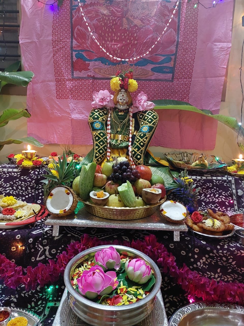 ಸಣ್ಣ ಉಕ್ಕಿನ, ತಾಮ್ರದ ಬಿಂದಿಗೆ ಅಥವಾ ಬೆಳ್ಳಿ ಚೆಂಬನ್ನು ಕಲಶದ ರೂಪದಲ್ಲಿ ಇಟ್ಟು ಅದರಲ್ಲಿ ನೀರನ್ನು ತುಂಬಿಸಿ ಅದಕ್ಕೆ ಸ್ವಲ್ಪ ಖರ್ಜೂರ ಹಾಗೂ ದ್ರಾಕ್ಷಿಯನ್ನು ಹಾಕಬೇಕು. ಒಂದು ತಟ್ಟೆಯಲ್ಲಿ ಅಕ್ಕಿಯನ್ನು ಹರಡಿ ಅದರಲ್ಲಿ ಕಲಶವನ್ನು ಇಟ್ಟು, ಮಾವಿನ ಎಲೆ ಹಾಗೂ ವೀಳ್ಯೆದೆಲೆಯನ್ನು ಕಲಶದ ಸುತ್ತ ಜೋಡಿಸಿ ಅದರ ಮೇಲೆ ಅರಿಶಿಣ ಹಚ್ಚಿದ ತೆಂಗಿನಕಾಯಿಯನ್ನು ಇಟ್ಟು ಅದಕ್ಕೆ ಲಕ್ಷ್ಮಿಯ ಮುಖದ ಕವಚ ಧರಿಸಿ, ಹೊಸ ಸೀರೆಯನ್ನು ಉಡಿಸಿ ಅಲಂಕರಿಸುತ್ತಾರೆ. ಜೊತೆ ಒಡವೆಗಳನ್ನು ಹಾಕಿ ಸಿಂಗಾರಗೊಳಿಸುತ್ತಾರೆ.