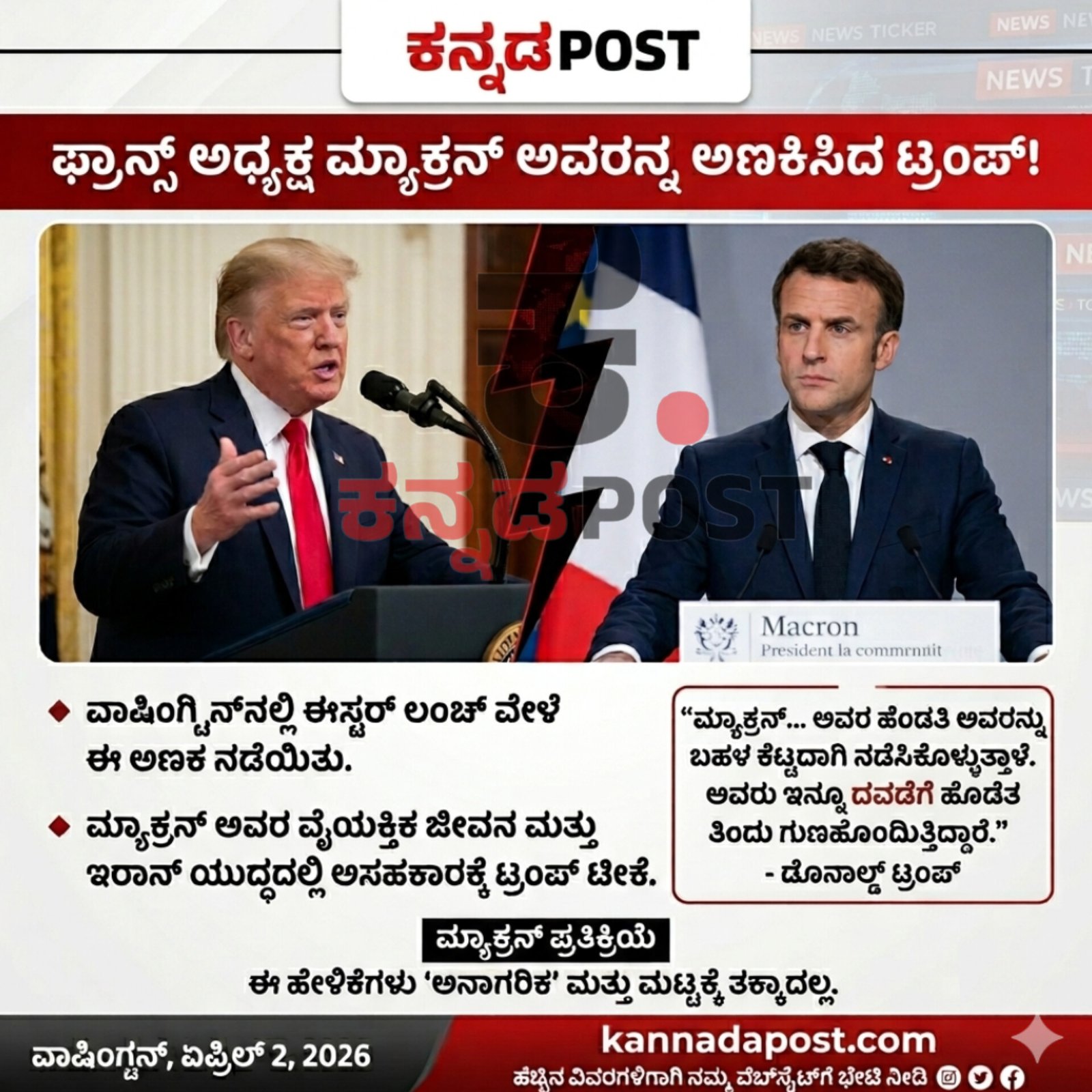 Washington|ವಾಷಿಂಗ್ಟನ್, ಏಪ್ರಿಲ್ 2, 2026:ಅಮೆರಿಕಾ ಅಧ್ಯಕ್ಷ ಡೊನಾಲ್ಡ್ ಟ್ರಂಪ್ (trump) ಅವರು ವೈಟ್ ಹೌಸ್ನಲ್ಲಿ ನಡೆದ ಈಸ್ಟರ್ ಲಂಚ್ ಕಾರ್ಯಕ್ರಮದಲ್ಲಿ ಫ್ರಾನ್ಸ್ ಅಧ್ಯಕ್ಷ ಎಮ್ಮಾನುಯೆಲ್ ಮ್ಯಾಕ್ರನ್ ಅವರನ್ನು ತೀವ್ರವಾಗಿ ಲೇವಡಿ ಮಾಡಿದ್ದಾರೆ.
