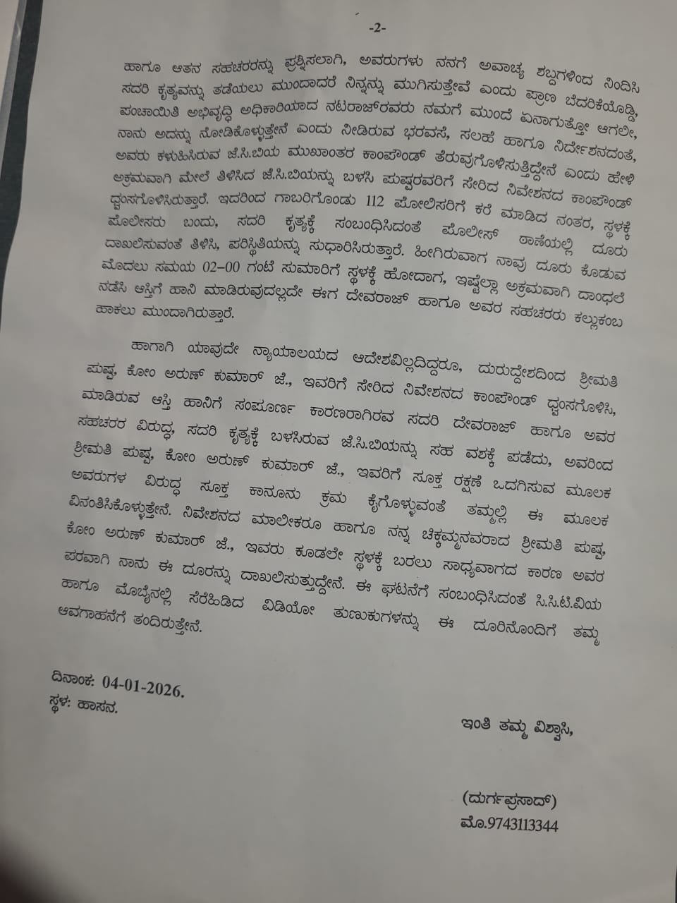 ದೂರಿನಲ್ಲಿ, ಪುಷ್ಪಾ ಅವರಿಗೆ ಸೇರಿದ ಆಸ್ತಿಯಲ್ಲಿದ್ದ ಕಾಂಪೌಂಡ್ ಹಾಗೂ ಶೆಡ್ ಅನ್ನು ದೇವರಾಜ್ ಅವರು ಅಕ್ರಮವಾಗಿ ತೆರವು ಮಾಡಿದ್ದಾರೆ, ಇದನ್ನು ಪ್ರಶ್ನಿಸಿದಾಗ ಪ್ರಾಣ ಬೆದರಿಕೆ ಹಾಕಿದ್ದಾರೆ ಎಂದು ಆರೋಪಿಸಲಾಗಿದೆ. ಅಲ್ಲದೆ, ಪುಷ್ಪಾ ಅವರಿಗೆ ಸೂಕ್ತ ಪೊಲೀಸ್ ರಕ್ಷಣೆ ನೀಡುವಂತೆ ಮನವಿ ಮಾಡಲಾಗಿದೆ.
