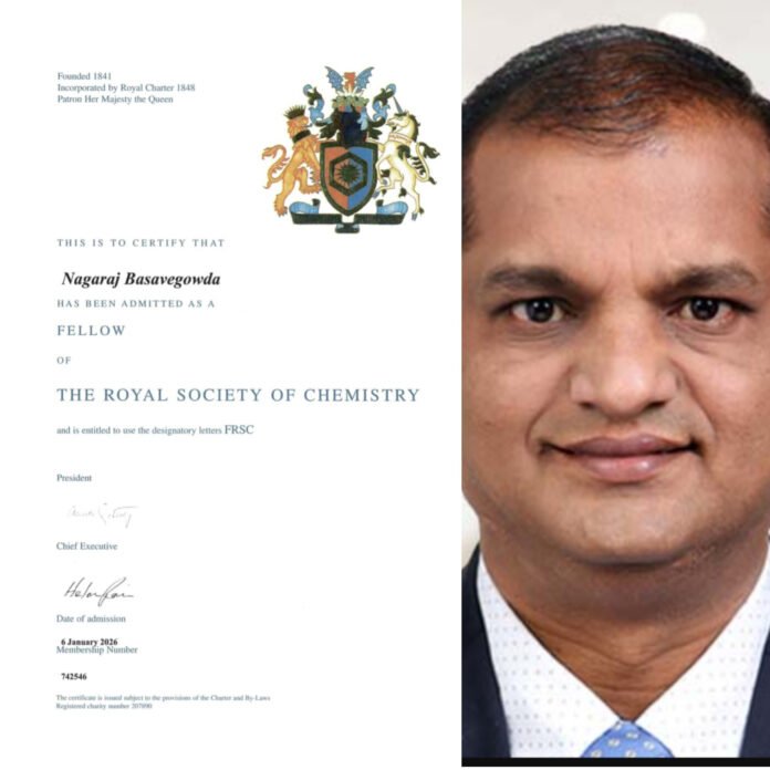 Young scientist Dr. Nagaraj Basavegowda, son of Basavegowda and Ammayamma from Bidarur village in Konanur hobli, has been admitted as a Fellow of the Royal Society of Chemistry.